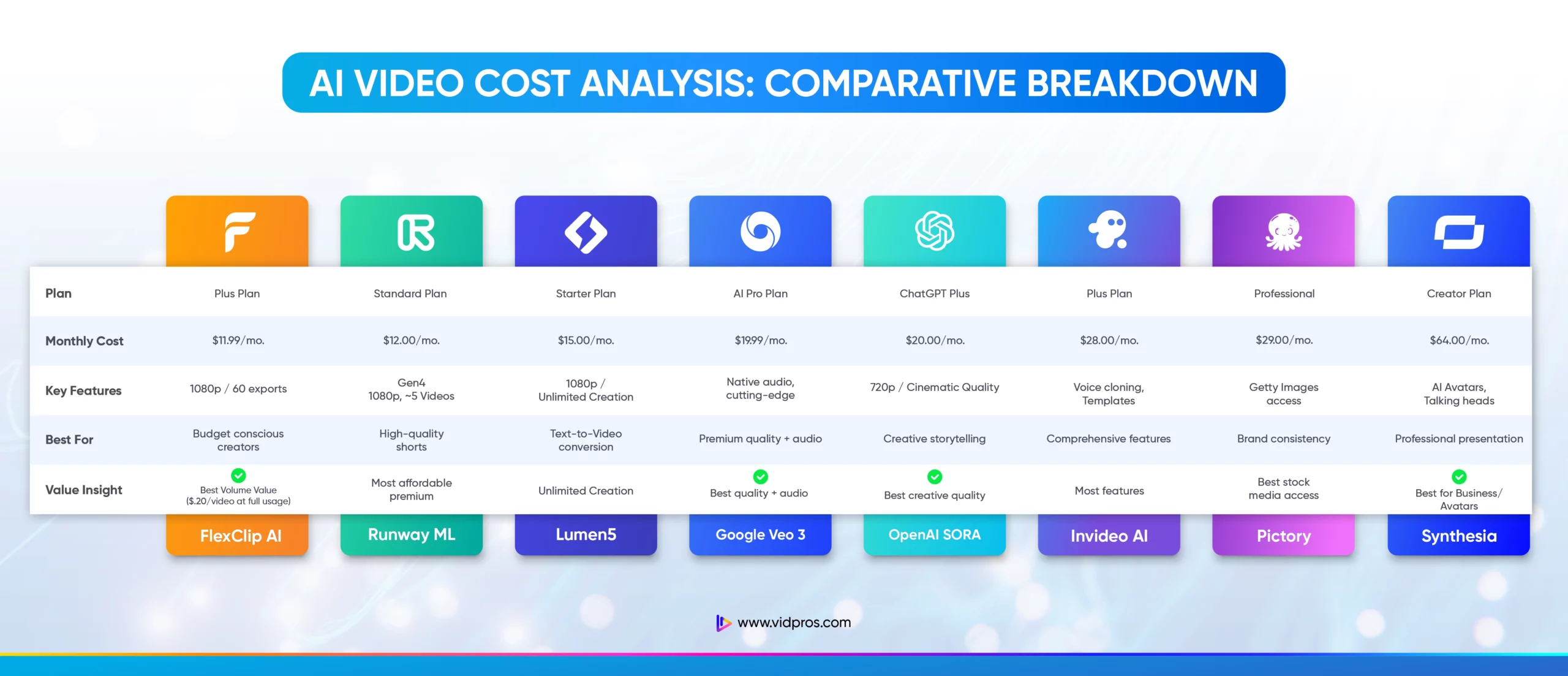 乍一看,AI 定价显得低得多。Genra.ai 报告称,根据模型、分辨率和时长,每个片段大约为 0.50 到 5.00 美元。一些市场比较将 AI 视频生成的价格定在每分钟 0.50 到 30 美元 左右,这就是为什么这么多平台宣传与工作人员、摄像机和剪辑团队相比能节省大量成本的原因。